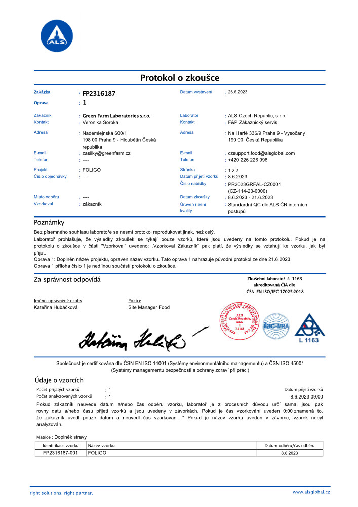 Foligo splňuje veškeré legislativní povinnosti v oblasti doplňků stravy a je ohlášeno u příslušného ústavu.